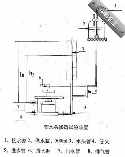 6、試驗時,將水頭管沖水至需要高度后關管夾開動秒表,同時測記起始水頭h1,經過時間t后,再測記終了水頭h2,如此連續測2-3次后,再使水頭管水位回落至需要高度,再連續測記數次,前后需6次以上,試驗終止。同是測記試驗時與終止時的水溫。