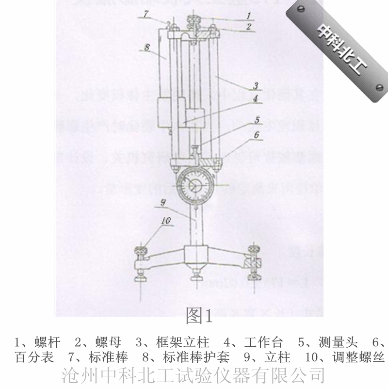 本儀器由:三角支架,標準棒和測量框架。測量框架上裝有百分表,標準棒裝置在方形的金屬護套里。