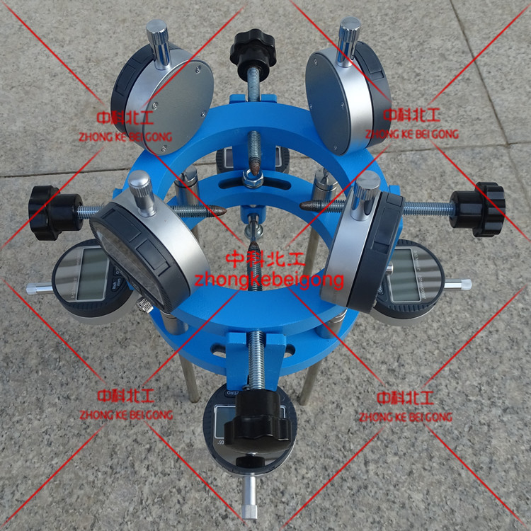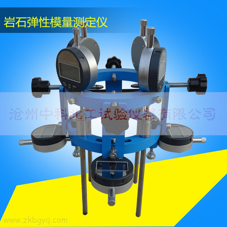 巖石的彈性模量是指無側向條件下,巖石試樣在單軸壓縮作用下縱向應力與縱向應變的比值。本設備是通過測定巖石試樣在單軸壓縮條件下的縱向應變值,據此計算出巖石的彈性模量。本設備符合標準中7.2千分表法。