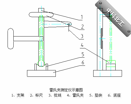 雷氏夾測定儀由支架、標尺、底座等零件組成。