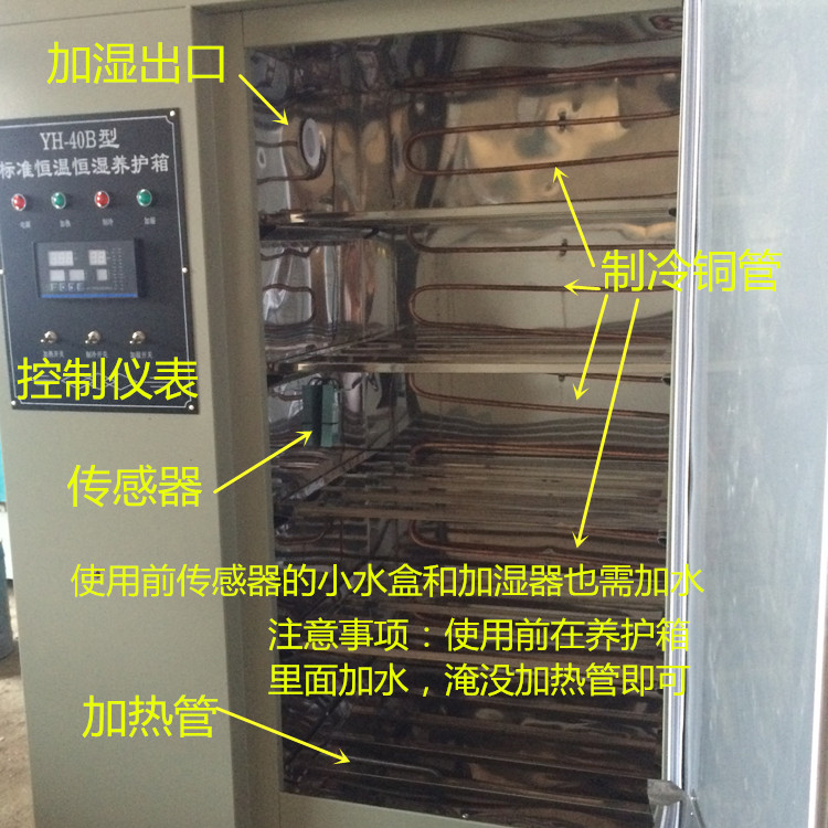 本設備在原養護箱基礎上,在總體造型內部結構方面,進行了一系列改進,箱門封閉采用磁力膠條封閉,內部增設了制冷裝置、加濕裝置,具有造型美觀、控溫控濕精度高等一系列優點,以使我廠在生產過程中進一步使產品做到經久耐用,達到用戶的理想使用目的。