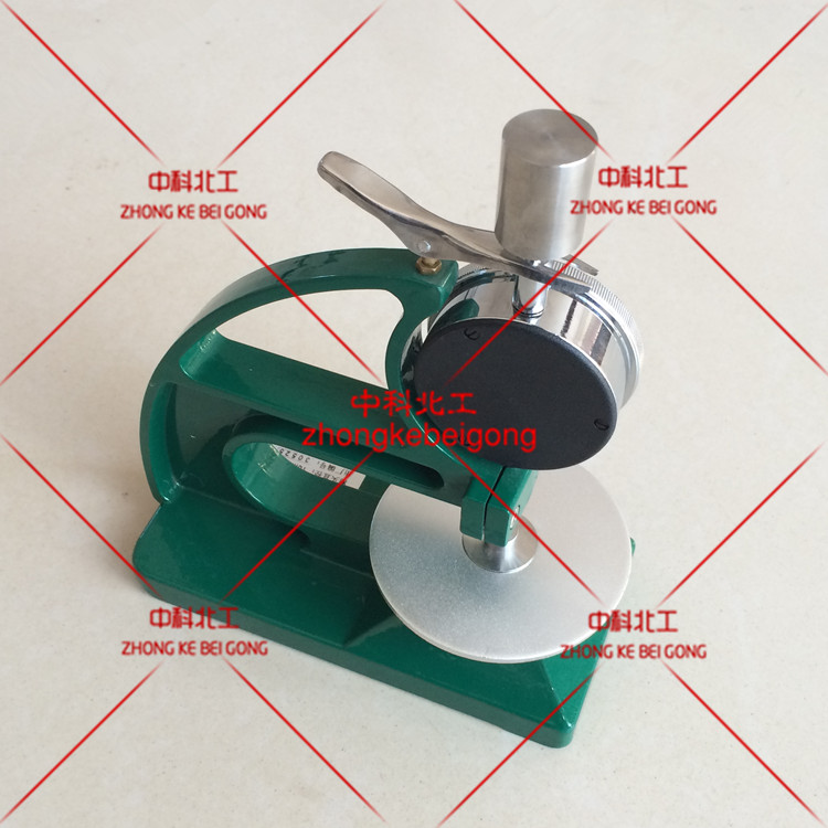5、平穩地抬起測厚儀測量壓板,將一塊已備好的被測小樣放在測量壓板與支座之間,輕輕地放下測量壓板使其與試樣接觸。待測厚儀指針穩定后記錄百分表此時的讀數,然后計算此小樣的實際厚度。