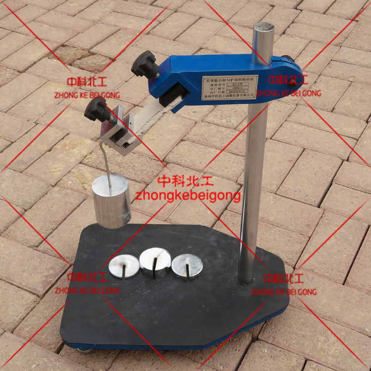 儀器主要有上夾具、下夾具及秤砣砝碼等組成,把被測試件按規定固定在上下夾具上進行夾緊,掛上陀及砝碼,使其面紙與石膏芯材的剝離而測出其粘結面所占百分比數據。