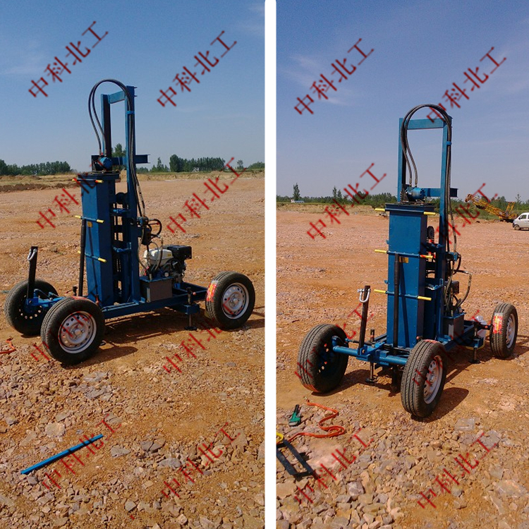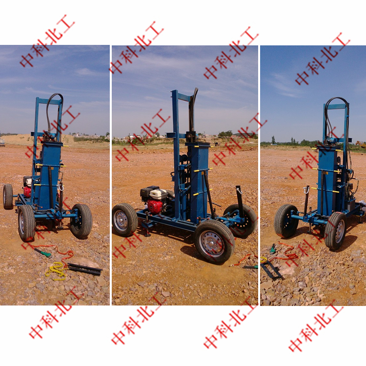 3、升起后將有探頭的探桿裝在擊錘架下的套孔內,上第一根探桿時主架子底下要裝上將探桿找正居中的角鐵,對好后,先將安全擋桿取下,再向下搬動升降手動閥門將擊錘架慢慢落下接好后。還要讓提擊錘架子的升降油缸繼續下降到底才可工作,再將讓探桿找正居中的角鐵去掉。提錘架子降到最底后,再向上搬動工作閥門,這時就機子就開始工作了。擊到所需錘擊數或深度后將工作閥門工作桿搬到中間位置,擊錘停止工作,如果工作停止后擊錘沒有落到底,可將工作閥門向下搬動,擊錘到底后立即將工作桿搬回中間位置。