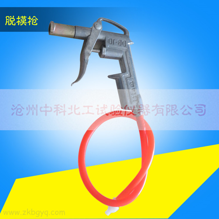 脫模槍,是制作試件的過程中必備配件。該脫模槍由槍頭、氣管組成,槍頭嘴可與試模底部中心孔配合,氣管接入氣泵,通氣后即可使用。該工具可大大提高脫模效率,降低勞動力。