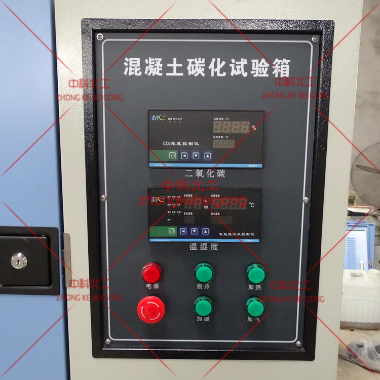 混凝土碳化試驗(yàn)箱為一個(gè)密封的箱體,試件放置在箱體內(nèi)隔板上,然后通過(guò)數(shù)字式控制儀表按設(shè)定的溫度、相對(duì)濕度、二氧化碳濃度進(jìn)行控制,以保證箱內(nèi)恒溫、恒濕、二氧化碳濃度恒定。