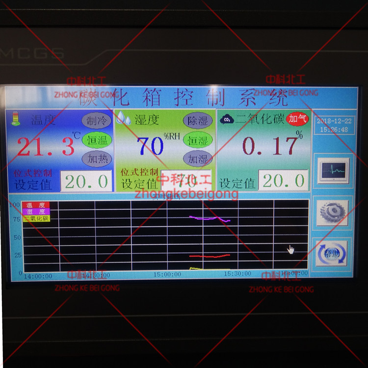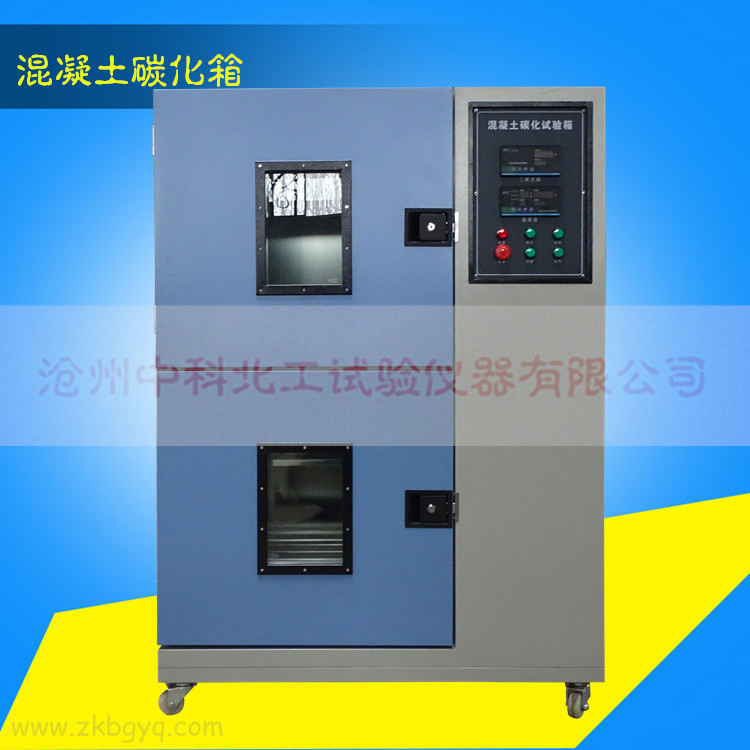 碳化試驗(yàn)箱主要由箱體、溫濕度及二氧化碳濃度控制系統(tǒng)組成。箱體的內(nèi)膽采用優(yōu)質(zhì)不銹鋼板,隔板采用不銹鋼型材制成,具有良好的保濕性、密封性、耐腐蝕性。